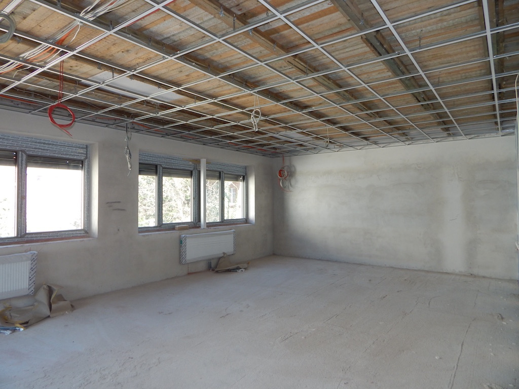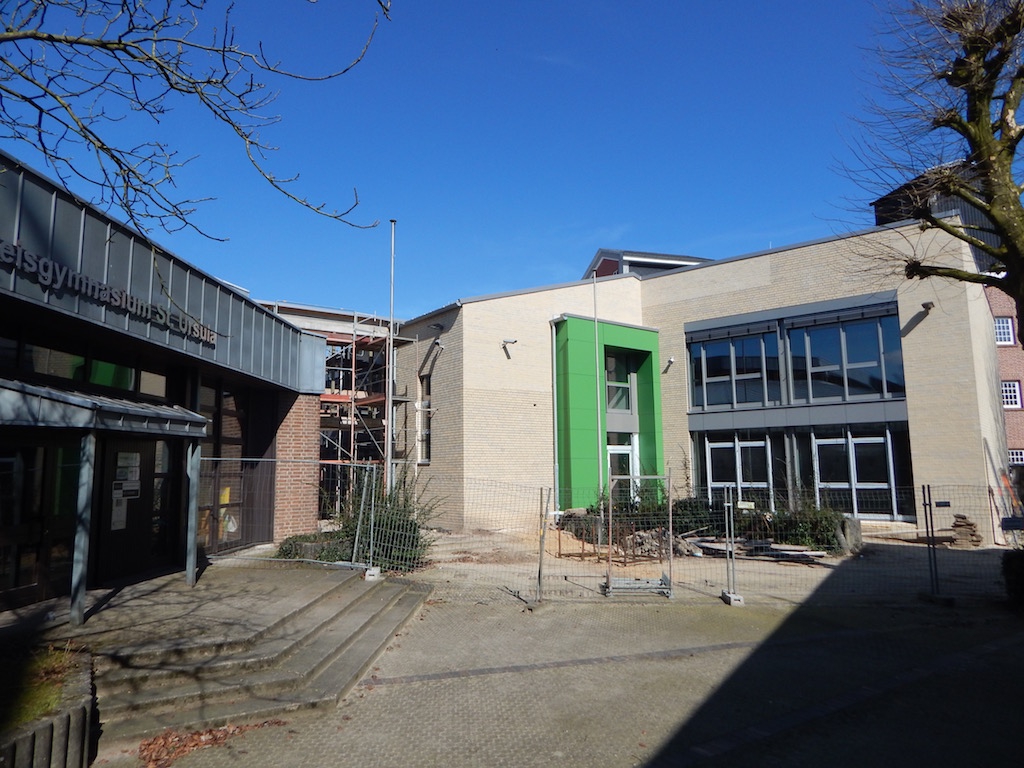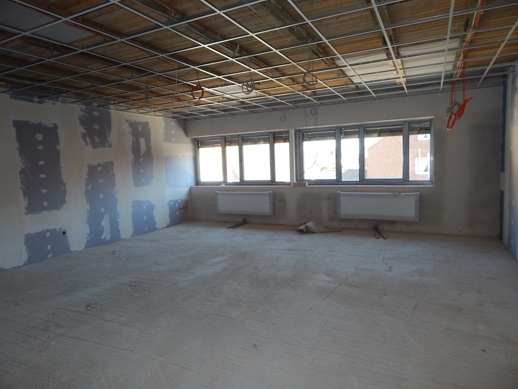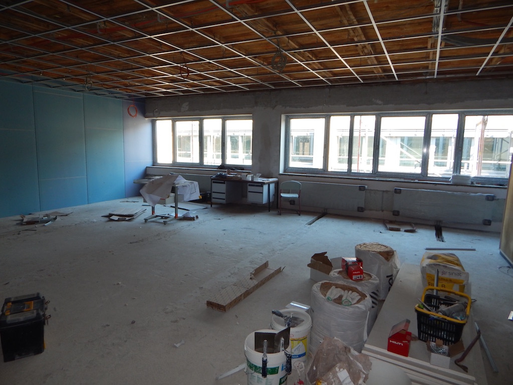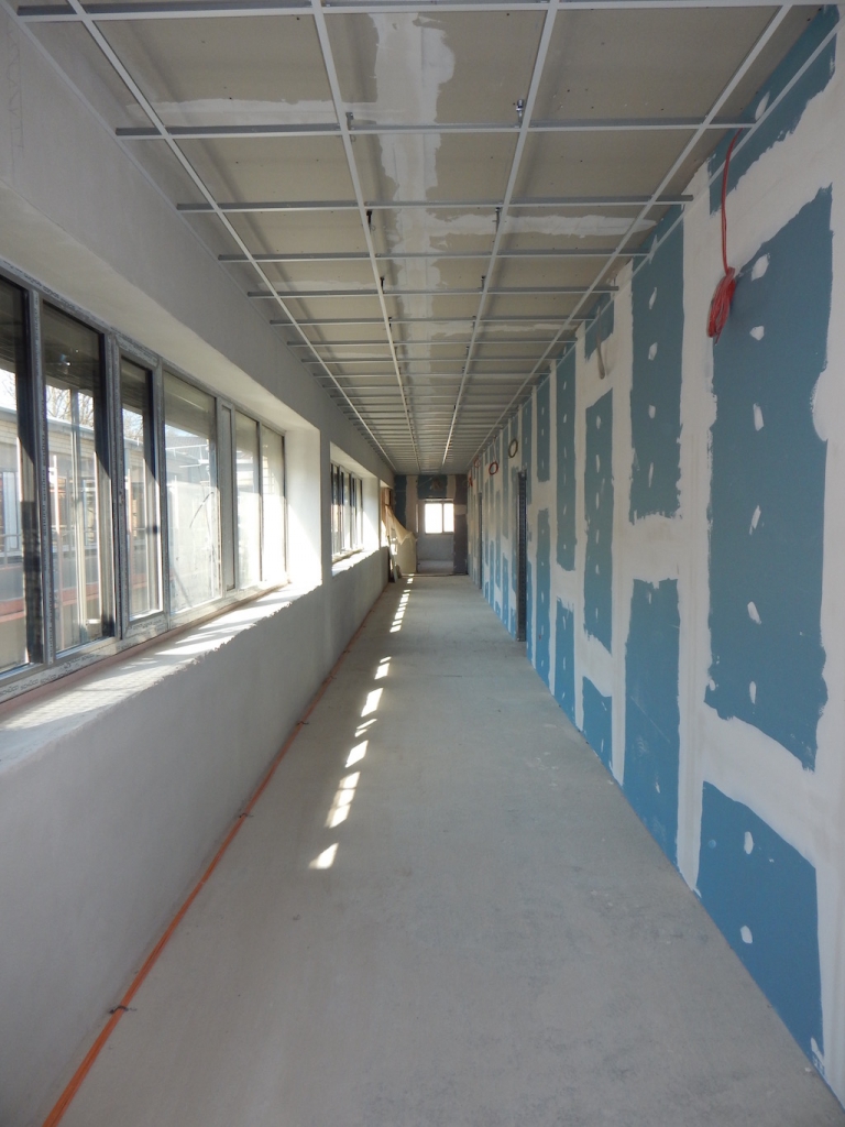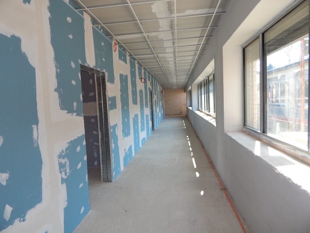 Die im letzten Sommer begonnenen großangelegten Renovierungs- und Umbaumaßnahmen am B-Gebäude gehen zügig voran. Die Trockenbauwände sind bereits eingezogen und vermitteln ein gutes Gefühl für die neuen räumlichen Gegebenheiten, die nach den Sommerferien für den Unterricht bereitstehen sollen. So werden sich im B-Gebäude im Anschluss an die Renovierungen 10 moderne Klassenräume befinden. Besonders der früher sehr dunkle Kursraum B205 wurde bereits durch ein großes Oberlicht deutlich aufgewertet.