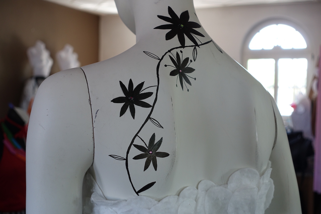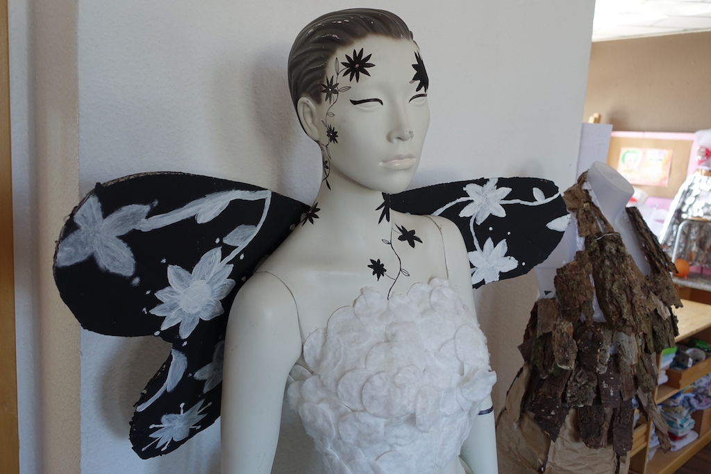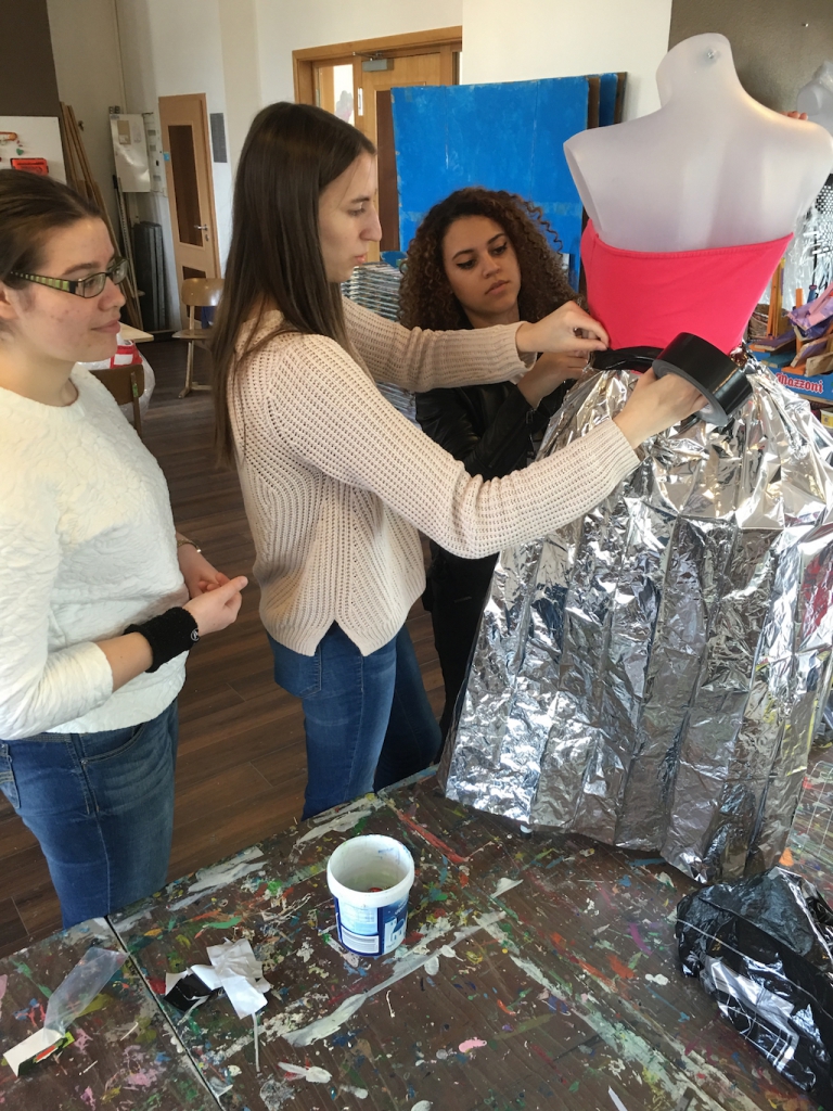 Zwei oder drei Schüler/Innen arbeiten zusammen und verhüllen eine Schaufensterfiguren mit ungewöhnlichen Materialien.
