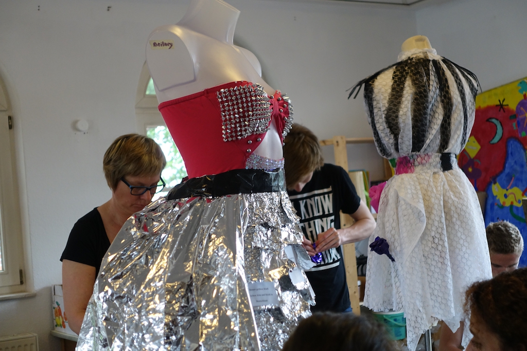 Vom Modehaus Schröder kamen Verpackungsmaterialien wie Folien und Spannbänder. Für den besonderen Effekt der eigenwilligen Kreationen brachten die Schüler/Innen sich z.B. Holzrinden, CDs oder Luftballons mit. Und aus dem Kunstschulfundus kam der Rest, wie Mullbinden und glitzernde Rettungsdecken.