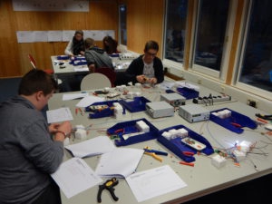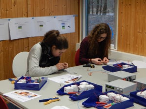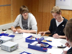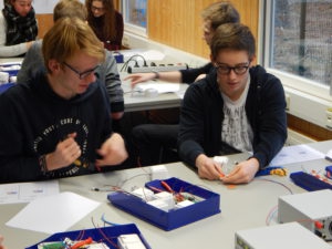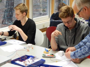 „Digitaltechnik im Alltag“ stand an diesem Nachmittag als Thema für die zwei Schülerinnen und acht Schüler auf dem Programm. Im Unterricht waren bereits Kenntnisse im Bereich der Digitaltechnik erworben worden, so dass mit der Unterstützung von Herrn Ulrich Struck (Leiter des ROYOUTH-Centers) und Frau Franziska Otto diese im Workshop aus anderer technischer Perspektive erkundet werden konnte. Sehr motivierend wirkte dabei die Verwendung von Tastern und Schaltern, wie sie tatsächlich im Hausbau eingesetzt werden. Die den Schülern bekannten Logikgleichungen fanden hier einen direkten Anwendungsbezug. Schaltungen für die Wohnzimmer oder Treppenhausbeleuchtung wurden entwickelt. Im zweiten Teil des Workshops  konnten die Schülerinnen und Schüler ihr Wissen mit Hilfe eines Arduino umsetzen und erweitern. Wurde im Unterricht mit Breadboard, ICs und LEDs gearbeitet, konnten anwendungsorientierte Probleme (z.B. eine Garagentorsteuerung) mit dem Microcontroller in einer Programmierumgebung gelöst und direkt ausprobiert werden.