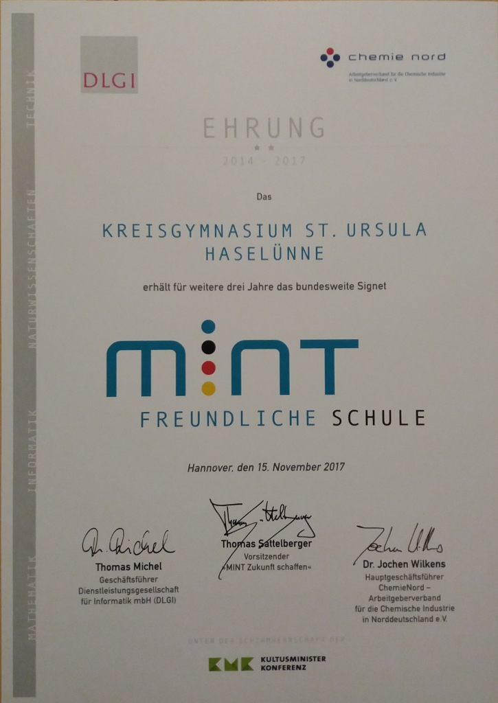 16 Schulen aus Niedersachsen wurden am 15.11.2017 im Heise-Verlag in Hannover als „MINT-freundliche Schule“ ausgezeichnet. Davon erhielten 11 Schulen das erste Mal die Auszeichnung und weitere 5 Schulen wurden nach dreijähriger erfolgreicher MINT-Profilbildung erneut mit dem Signet »MINT-freundliche Schule« geehrt, so auch das Kreisgymnasium. Damit gibt es nun 54 MINT-freundliche Schulen in Niedersachsen.