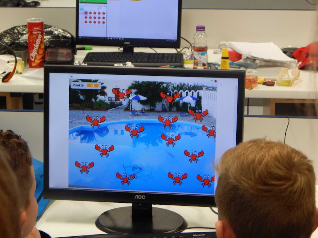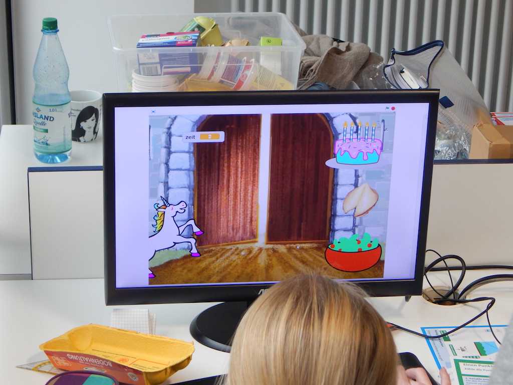 Zum Abschluss des Workshops präsentierte jede Gruppe ihr programmiertes Spiel und ihren Game-Controller. Die Ergebnisse konnten sich sehen lassen (siehe fotografierte Bildschirme)!