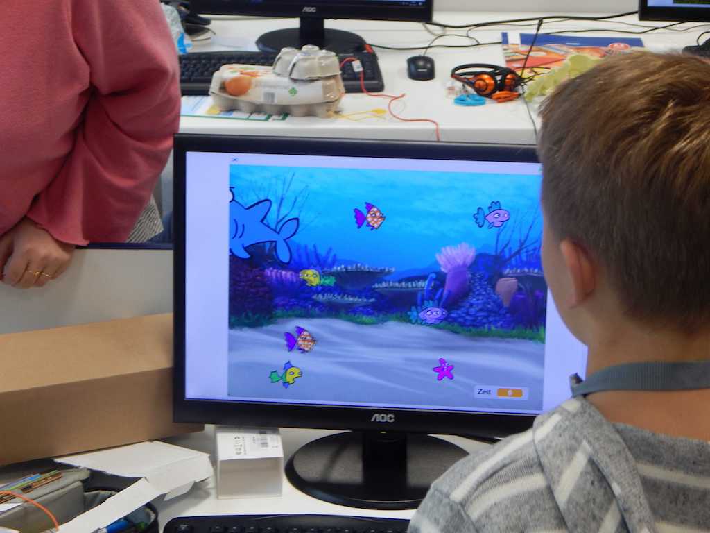 Um die Spielfigur des Programms gut steuern zu können, bauten alle Schüler mit den mitgebrachten Bastelmaterialien einen eigenen Game-Controller. Verwendet wurde dazu ein Makey-Makey und z.B. vier Kronkorken, durch die die Figur nach oben, nach unten, nach rechts und nach links bewegt werden konnte. Die Schülerinnen und Schüler hatten viel Spaß, der Kreativität waren keine Grenzen gesetzt. Alle elektrisch leitfähigen Materialien waren geeignet.