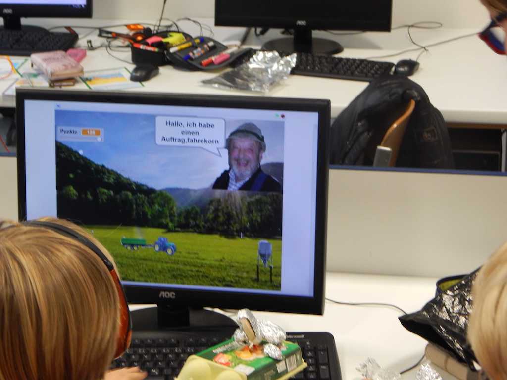 Es folgte eine Einführung in die Programmierung mit Scratch, eine graphisch-basierte Programmiersprache. Bunte Bausteine werden einfach zusammengeklickt und eine oder mehrere Figuren bewegen sich auf einem bunten Hintergrund (siehe Bilder). Scratch wurde vom MIT ursprünglich für erste Programmiererfahrungen von Grundschülern entwickelt und wird heute sogar an Hochschulen eingesetzt.