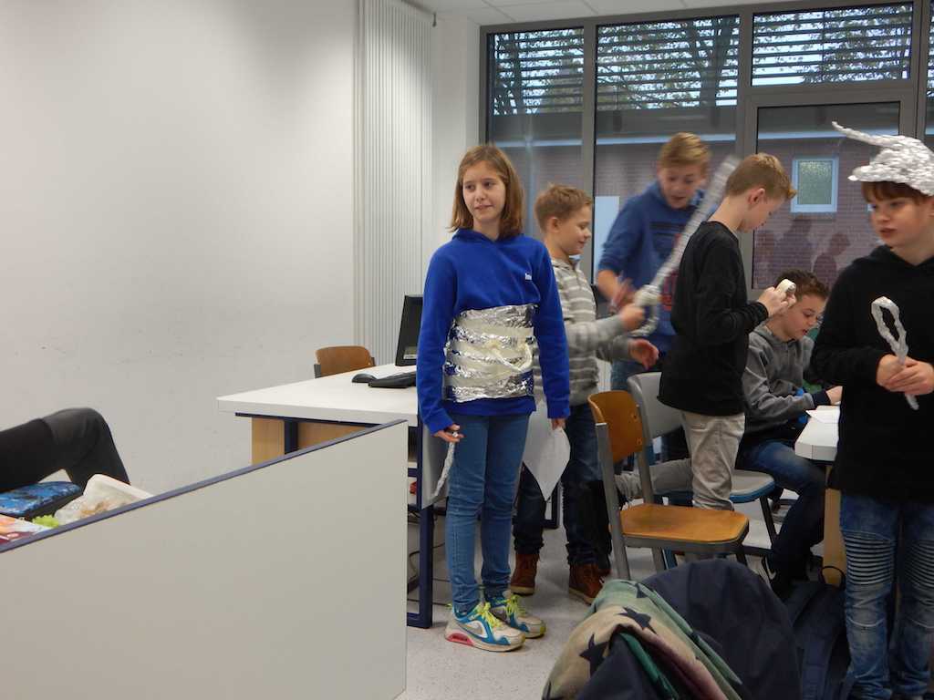 Gestartet wurde mit einem Rollenspiel, bei dem ein Roboter mit Alufolie kreativ verschönert (siehe Bilder) von einem Navigator und einem Programmierer durch den Raum gelotst werden sollte. Hier konnten erste Erfahrungen mit Programmierbefehlen und seiner Ausführung gemacht werden.