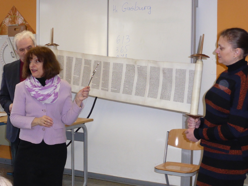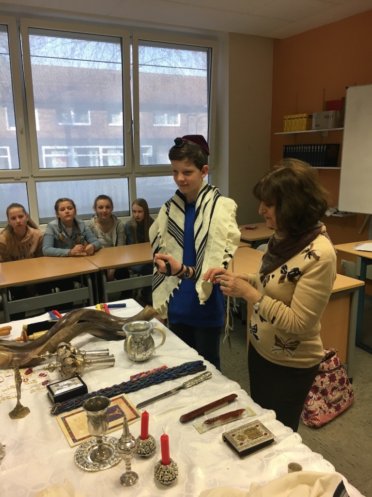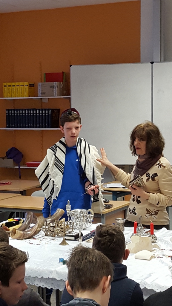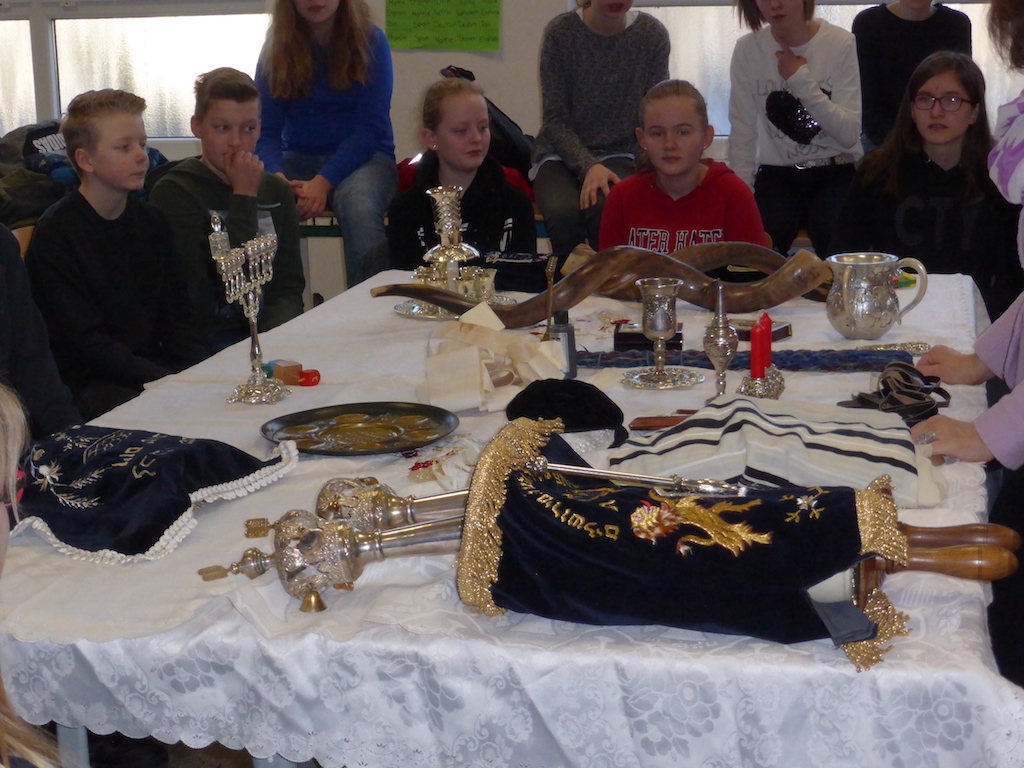 Der Projekttag beginnt mit einem Film und einer Ausstellung, die von den Mitarbeitern aufgebaut wird und zeigt Gegenstände des jüdischen Lebens. Die Schülerinnen und Schüler erfahren so mit allen Sinnen, wie sich die jüdische Religion und Lebensweise im Alltag zeigt. Die Mitarbeiter erläutern einzelne wichtige Gegenstände, wie z.B. Thorarolle, Pergament, Schofarhörner und die Schülerinnen und Schüler haben Gelegenheit diese auszuprobieren und Fragen zu stellen.