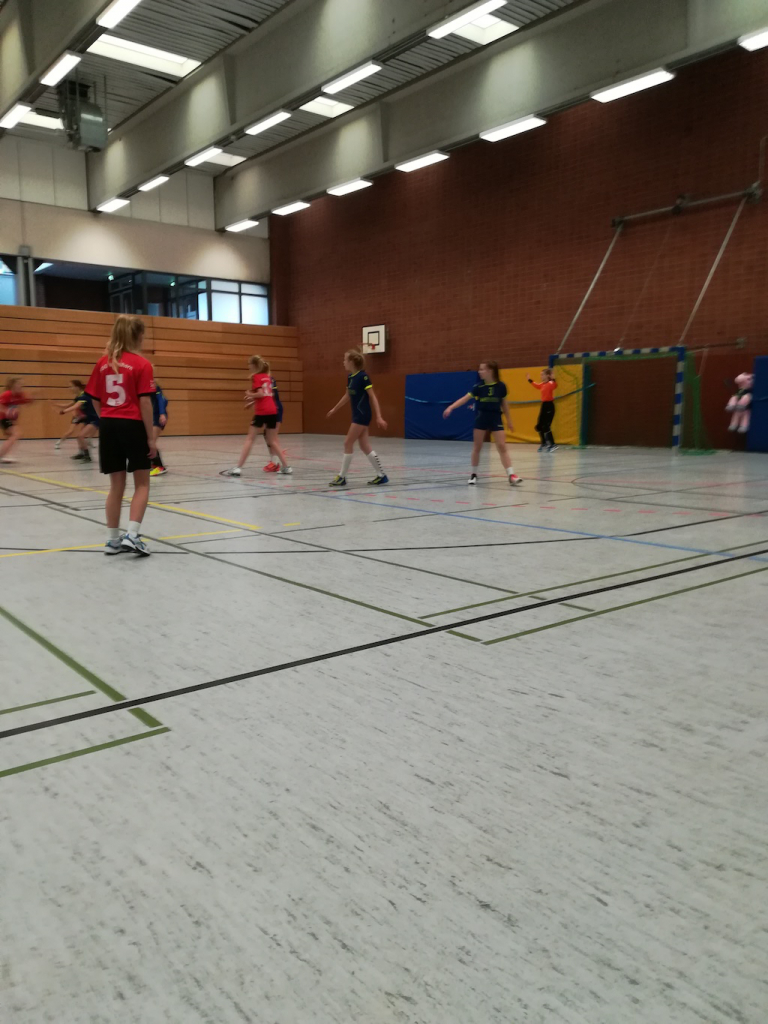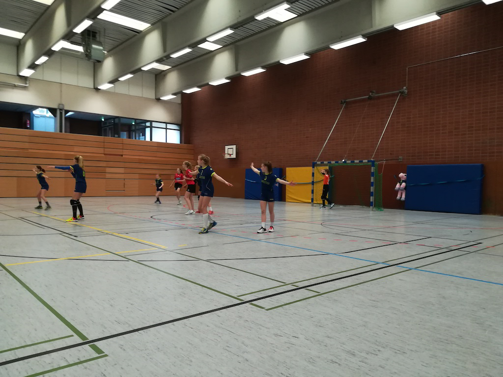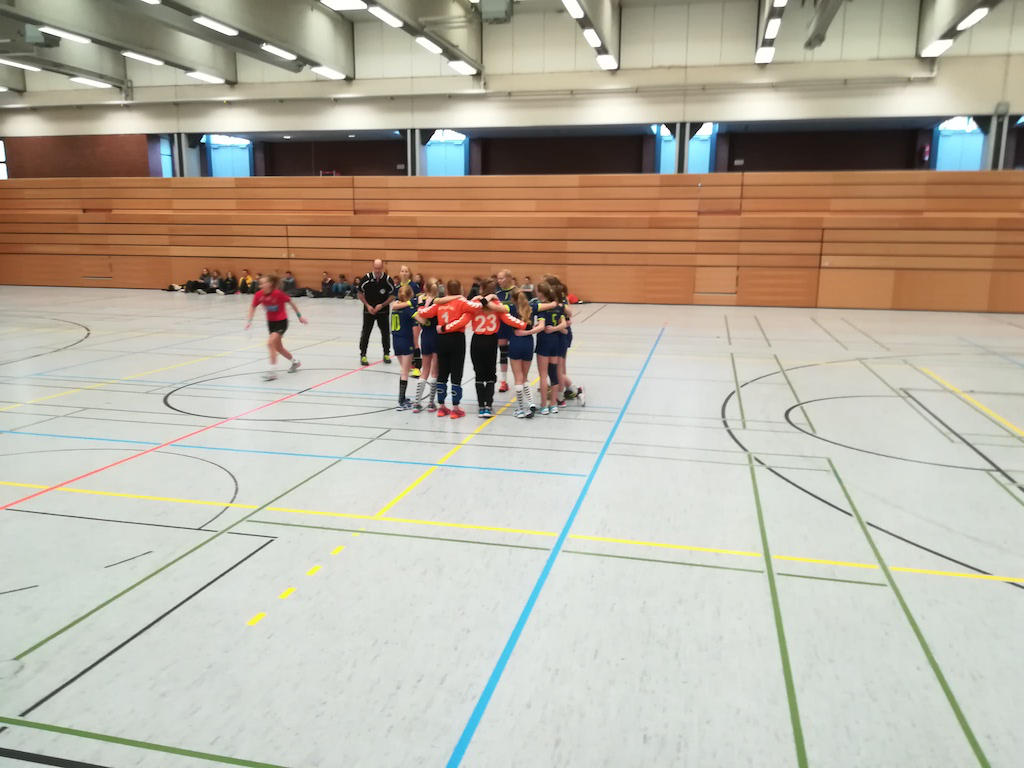 Während der gesamten ersten Halbzeit lag unser Team knapp in Führung. Vor allem Rieke und Frederike vielen hier durch starke Abschlüsse auf. Mehrere Unkonzentriertheiten verhinderten dabei eine deutlichere Führung (9:8) zum Pausenpfiff. Die zweite Halbzeit startete denkbar schlecht. Nach fünf Minuten lagen wir mit zwei Toren hinten. Eine 2-minütige Überzahl drehte das Spiel jedoch wieder. Mit einem Unentschieden ging es in die letzten Minuten. Wiederholte einfache Abspielfehler unterliefen beide Seiten und verdeutlichten die Nervosität der Mannschaften. Dank einer starken Abwehrleistung und immer wieder Tore von Rieke konnten wir 30 Sekunden vor Schluss bei eigenem Ballbesitz die ein Tor Führung eigentlich über die Zeit spielen. Ein unkonzentrierter Pass ermöglichte Nordhorn aber einen Tempogegenstoß, der aber an der Mittellinie heldenhaft von Rahel abgefangen wurde.