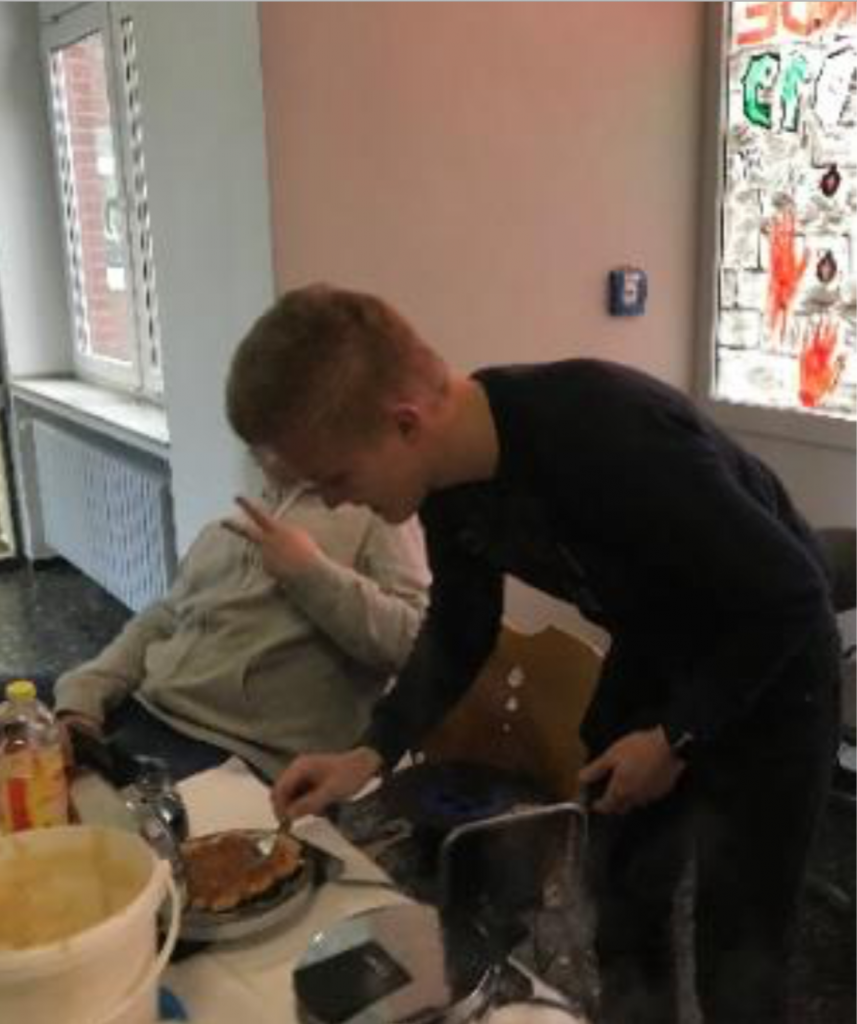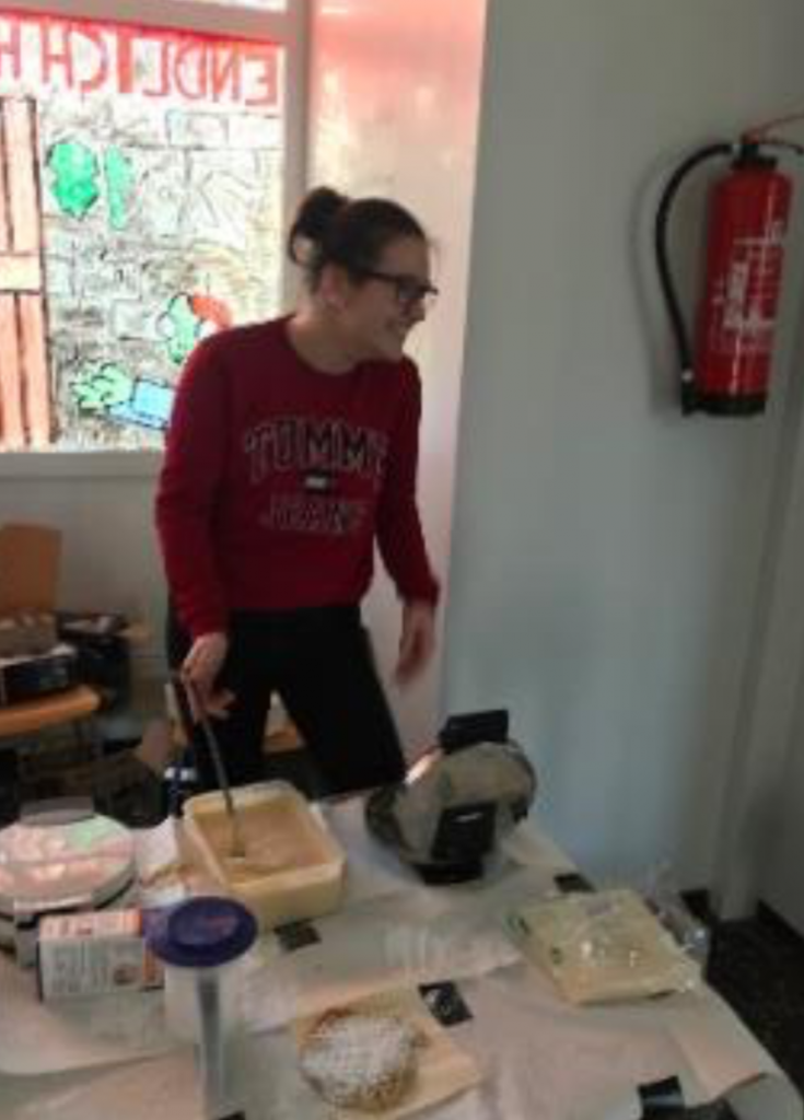 Die diesjährige Waffelaktion fand am Freitag, den 18.01.2019 statt. Zum ersten Mal wurde diese Aktion nicht in der Aula im H-Gebäude durchgeführt, sondern die gesamte SV teilte sich auf 3 Stationen an verschiedenen Standorten auf. Das war einmal im „übergangsweisen“ Aufenthaltsraum im Keller des G-Gebäudes, dann im breiten„Übergangsflur“ zwischen A- und G-Gebäude auf Ebene des „übergangsweisen“ Sekretariats, bzw.Lehrerzimmers und zu guter Letzt im Flur des A- Gebäudes auf Ebene der Musikräume.