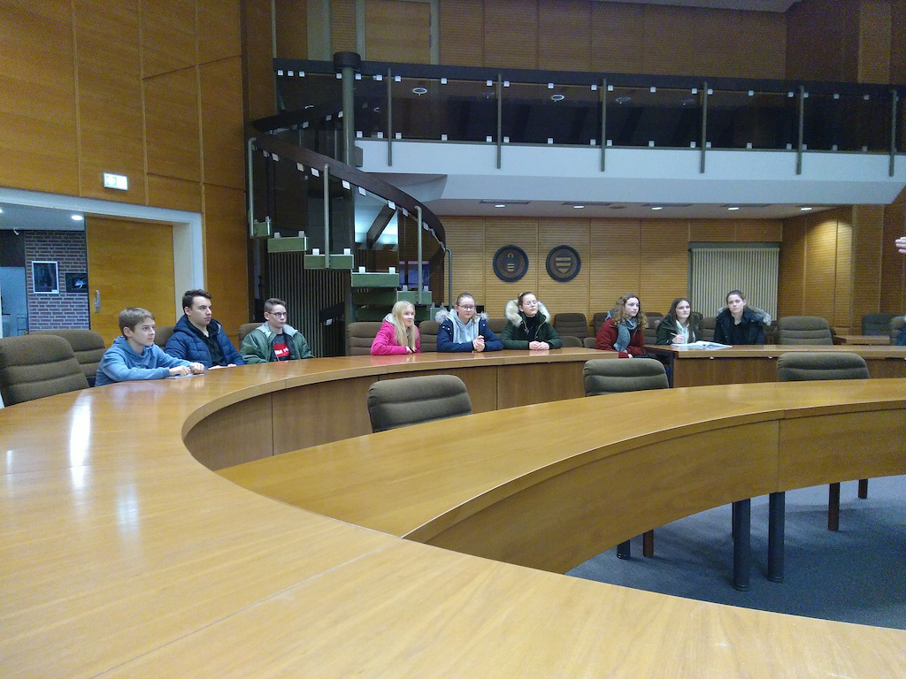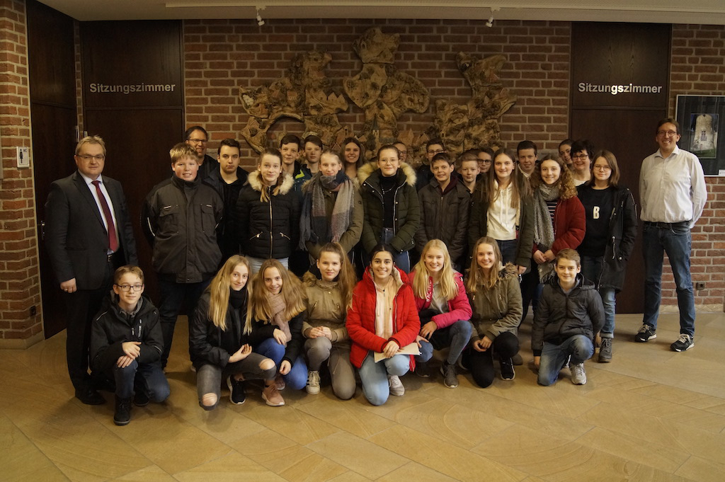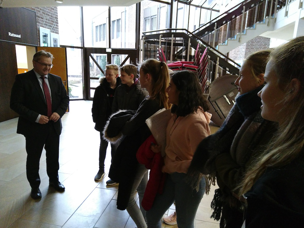 Die Klasse 8b hat am Donnerstag im Politik-Wirtschaft-Unterricht das Haselünner Rathaus erkundet. Nach der Begrüßung und einführenden Worten durch den Bürgermeister Herrn Schräer im Ratssaal wurden die Schülerinnen und Schüler in drei Gruppen durch die verschiedenen Abteilungen des Rathauses geführt, vom Abholkorb für die gelben Säcke über den Raum für die standesamtlichen Trauungen bis hin zur Fahrradsammlung des Fundbüros.