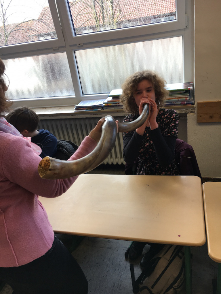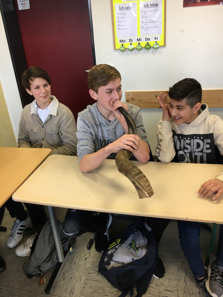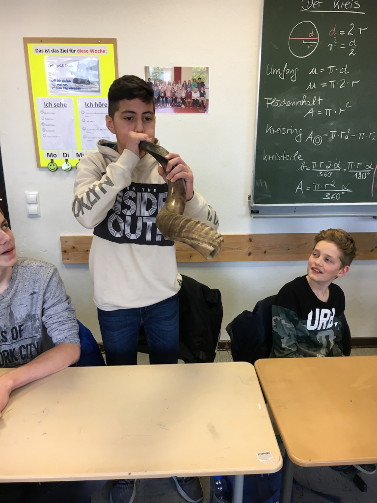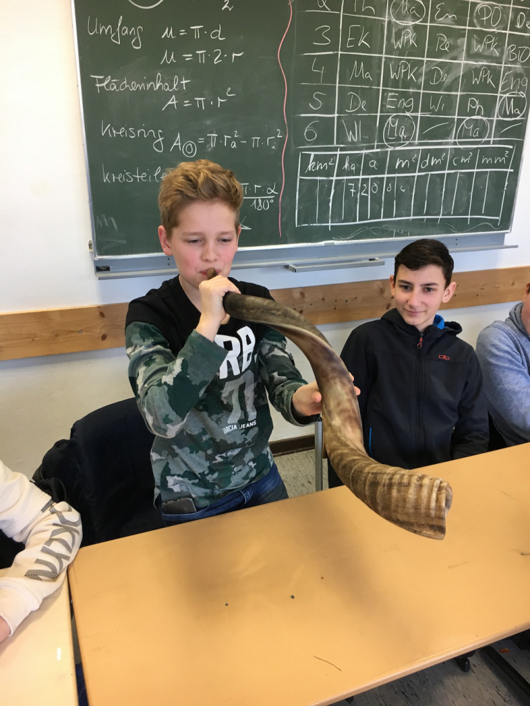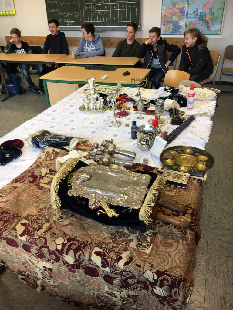 Der Projekttag beginnt mit einem Film und einer Ausstellung, die von den Mitarbeitern aufgebaut wird und zeigt Gegenstände des jüdischen Lebens. Die Schülerinnen und Schüler erfahren so mit allen Sinnen, wie sich die jüdische Religion und Lebensweise im Alltag zeigt. Die Mitarbeiter erläutern einzelne wichtige Gegenstände, wie z.B. Thorarolle, Pergament, Schofarhörner und die Schülerinnen und Schüler haben Gelegenheit diese auszuprobieren und Fragen zu stellen.