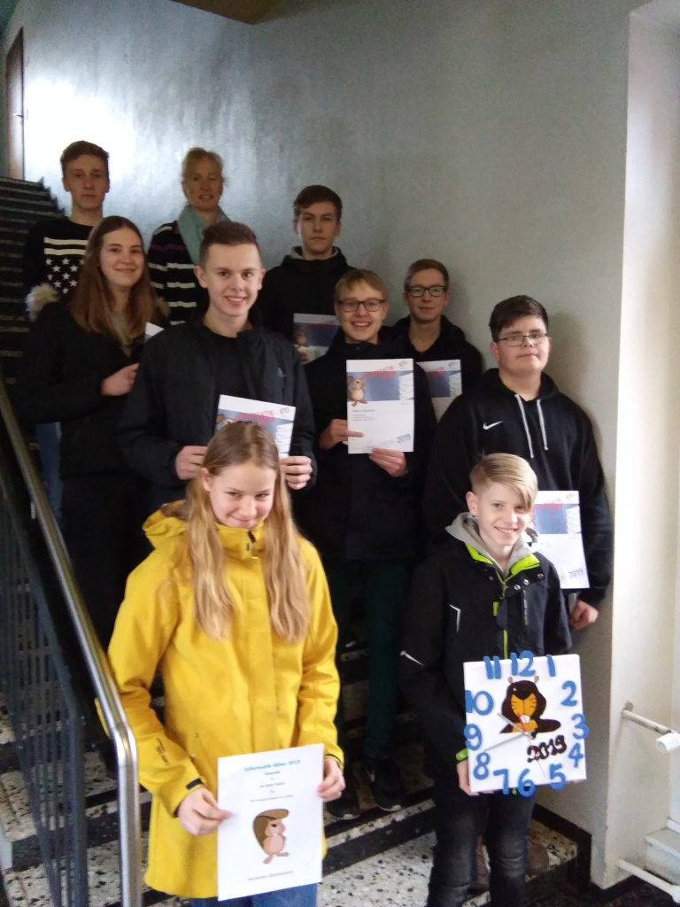 Dieses Jahr haben 8 Schülerinnen und Schüler einen 2. Preis erreicht: Jule Bohmann, Jonas Evermann, Markus Hamacher, Luca Lampe, Louis Röckers, Tobias Rühlmann, Pascal Schlangen und Konrad Weßling. Als kleinen Sonderpreis erhielten sie einen bedruckten Handyhalter aus Holz.