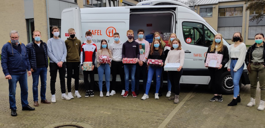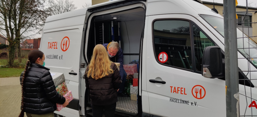 Auf den Fotos sieht man die Klassen 5c, 9a und 10c, die tatkräftig beim Einladen der Pakete in den Transporter der Tafel Haselünne geholfen haben. Der Leiter der Tafel, Herr Schoon, bedankt sich herzlich bei allen Beteiligten für ihr soziales Engagement!