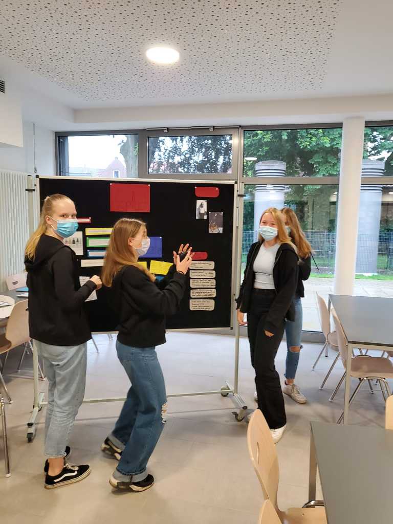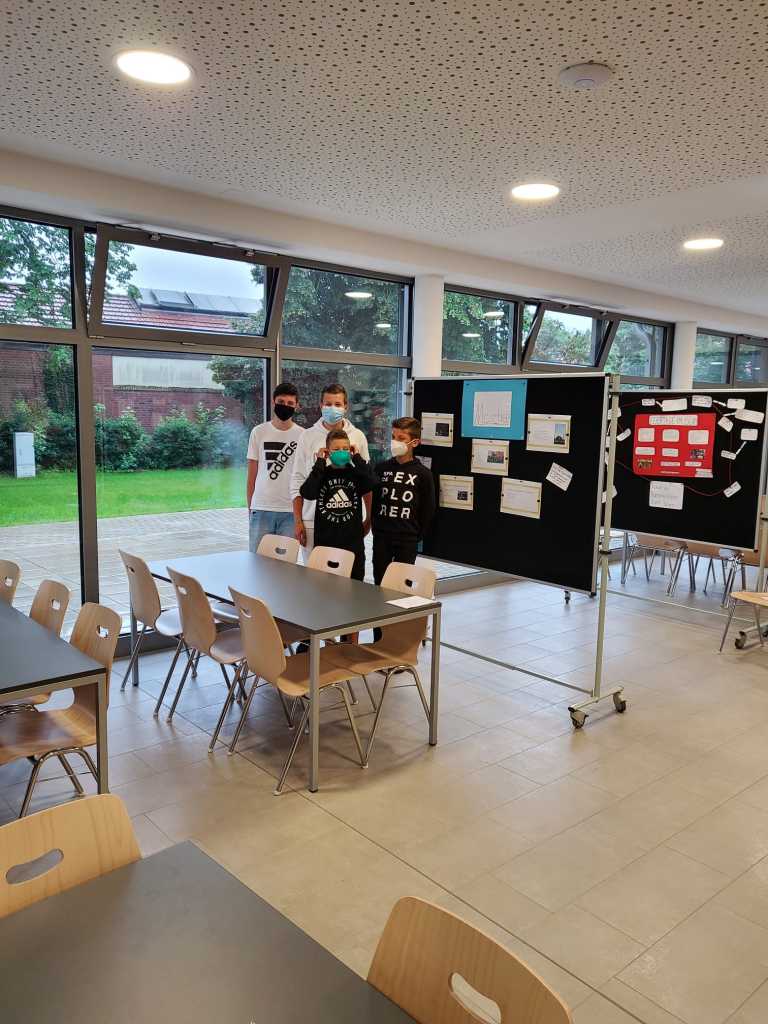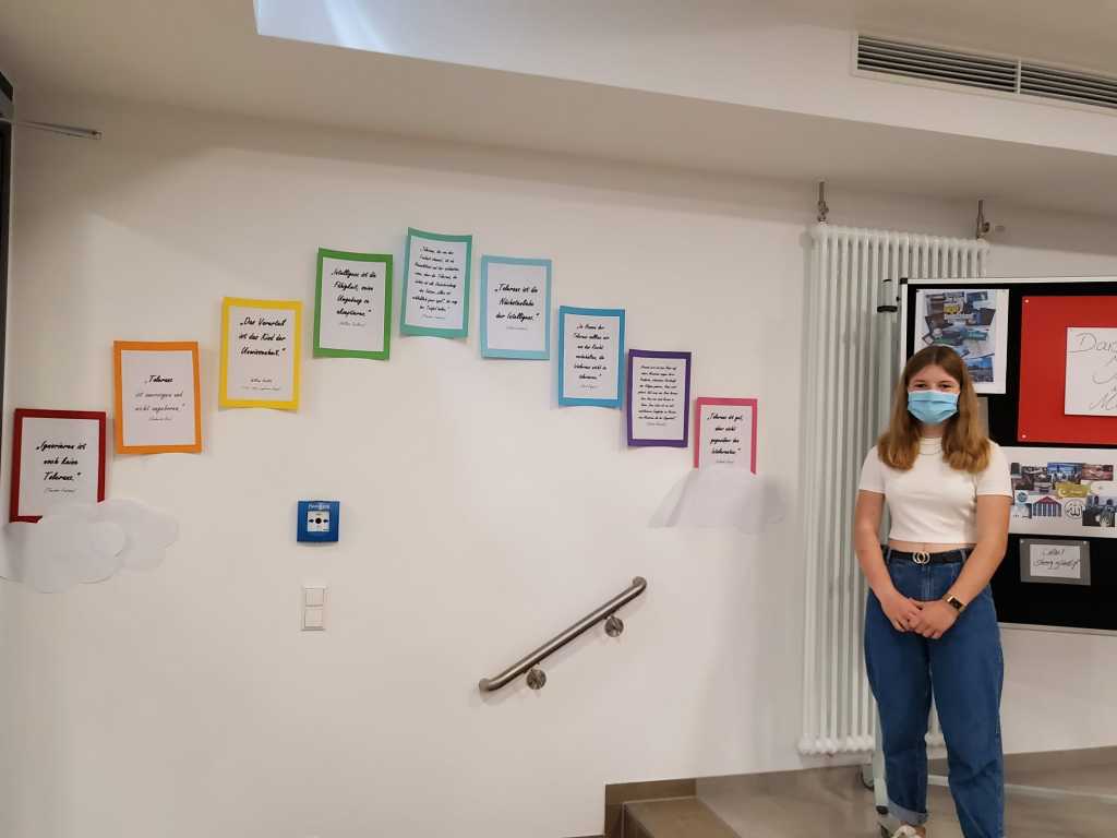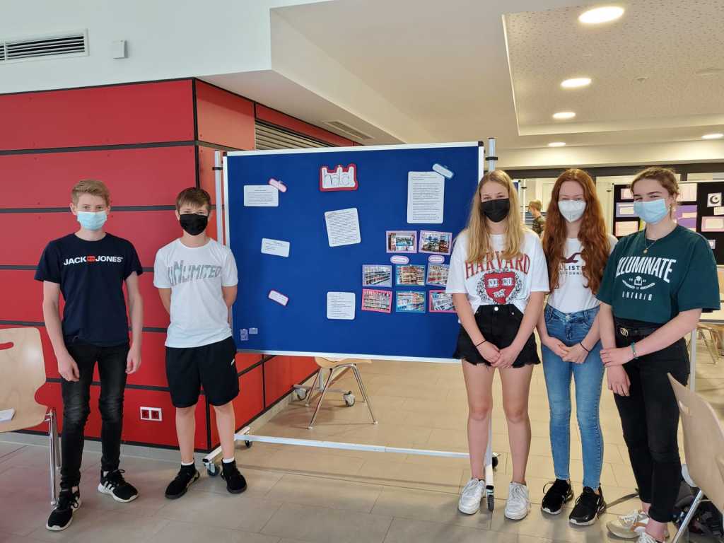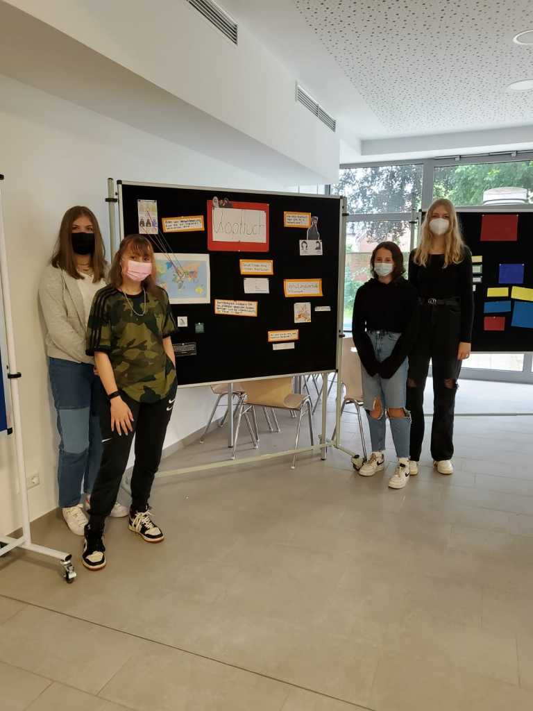 Im Rahmen des Religionsunterrichts bei Frau Sassen haben die Schülerinnen und Schüler der Klassen 8a und 8b am Ende dieses herausfordernden Schuljahres in einer gemeinsamen Anstrengung eine Ausstellung zum Thema „ISLAM – Gemeinsam gegen Vorurteile“ organisiert. Wichtig war ihnen dabei, sich gemeinsam als Klasse für die Schulgemeinschaft und für „Schule gegen Rassismus – Schule mit Courage“ zu engagieren. Ausgangspunkt war die Beschäftigung mit der Darstellung des Islam in den Medien, woraus sich zahlreiche Fragen ergeben haben. An erster Stelle diejenige, ob es sich bei dem daraus ergebenden Eindruck nur um Vorurteile handelt.  Von dem englischen Essayisten und Schriftsteller William Hazlitt (1778-1830) stammt das Zitat: „Das Vorurteil ist das Kind der Unwissenheit.“ Somit galt es zunächst, Wissen zu erwerben – und nichts zu verklären, aber vieles zu relativieren. Dies spiegelt sich eindrücklich in der Ausstellung wider: Ausgehend von Collagen aus Zitaten und Bildern über den Islam, über die sich daraus ergebenden Konsequenzen (Ergebnisse aus Statistiken über das Bild der Deutschen vom Islam), wird einerseits grundlegendes Wissen vermittelt und andererseits genauer auf die kontrovers diskutierten Themen (das Tragen von Kopftüchern, Bau von Moscheen, Extremismus) eingegangen, bis am Ende als wünschenswerter Ausblick das Thema „Integration“ in den Vordergrund gerückt wird. Zu vielen Stellwänden haben die Schülerinnen und Schüler eigens Handouts bereitgelegt und beim Verlassen der Ausstellung sind in Form eines Regenbogens und in entsprechenden Farben Zitate zum Thema „Toleranz“ angeordnet.