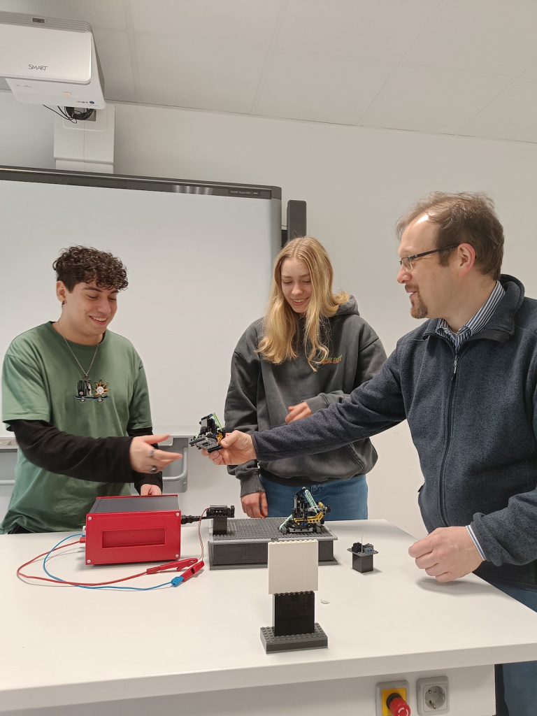 Das Interferometer leistet aber noch mehr. In einer anderen Konfiguration können sogenannte „Welcher-Weg-Experimente“ durchgeführt werden, die eindrucksvoll zeigen, dass zur Beschreibung von quantenmechanischen Phänomenen neben den Welleneigenschaften auch Teilcheneigenschaften notwendig sind. – Die Jugendlichen in Dr. Allmers’ Physikkurs sind von ihrem neuen Messgerät sichtlich angetan: „Toll, so was aus Lego aufgebaut zu sehen!“ äußert sich Thomas aus dem Jahrgang 13). „Und dabei überrascht das kompakte Design“, merkt Johanna (ebenfalls Jg. 13) an. Die Kursteilnehmer sind ferner davon begeistert, wie einfach sich das Lego-Laserinferometer des KGH justieren lässt.