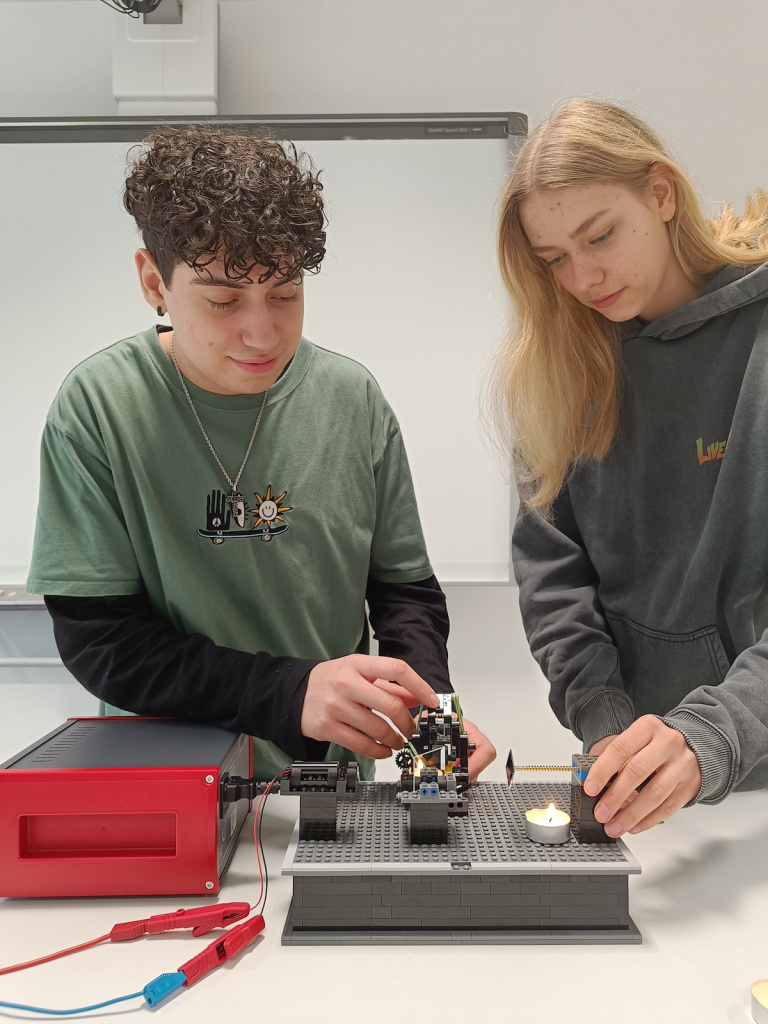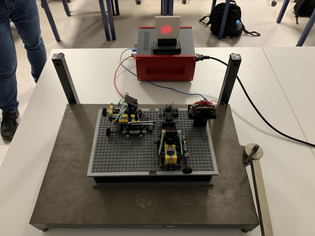 Dass Physikunterricht in der Oberstufe auch alles andere als trocken und weltfern sein kann – das zu zeigen, ist dem Haselünner Physiklehrer Dr. Tobias Allmers ein echtes Anliegen. „Gerade während der Qualifikationsphase – also in den letzten beiden Schuljahren – versuche ich immer Projekte mit dem Physikkurs zu realisieren.“ berichtet er. „Dies soll zum einen Physik im Alltag veranschaulichen und zum anderen den Interessen des Kurses gerecht werden.“ Aus diesem Grunde steht auch auf dem Pult im Physikraum ein Gerät: Lego-Steine, Zahnräder, Gummibänder und Kabel bilden ein kompaktes Ganzes. Dass am Kreisgymnasium St. Ursula mit Lego vor allem geforscht und experimentiert wird, dürfte bekannt sein, doch dieses Gerät ist neu; es handelt sich um ein so genanntes Interferometer, ein faszinierendes Instrument, welches in der aktuellen Forschung zur Detektion von Gravitationswellen eingesetzt wird und das sich (in der) zur Demonstration von quantenmechanischen Zusammenhängen eignet. Bei der hier realisierten Variante handelt es sich um einen Nachbau des Lego-Interferometers, der an der Universität Osnabrück entwickelt wurde.