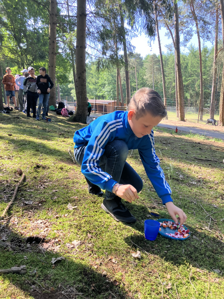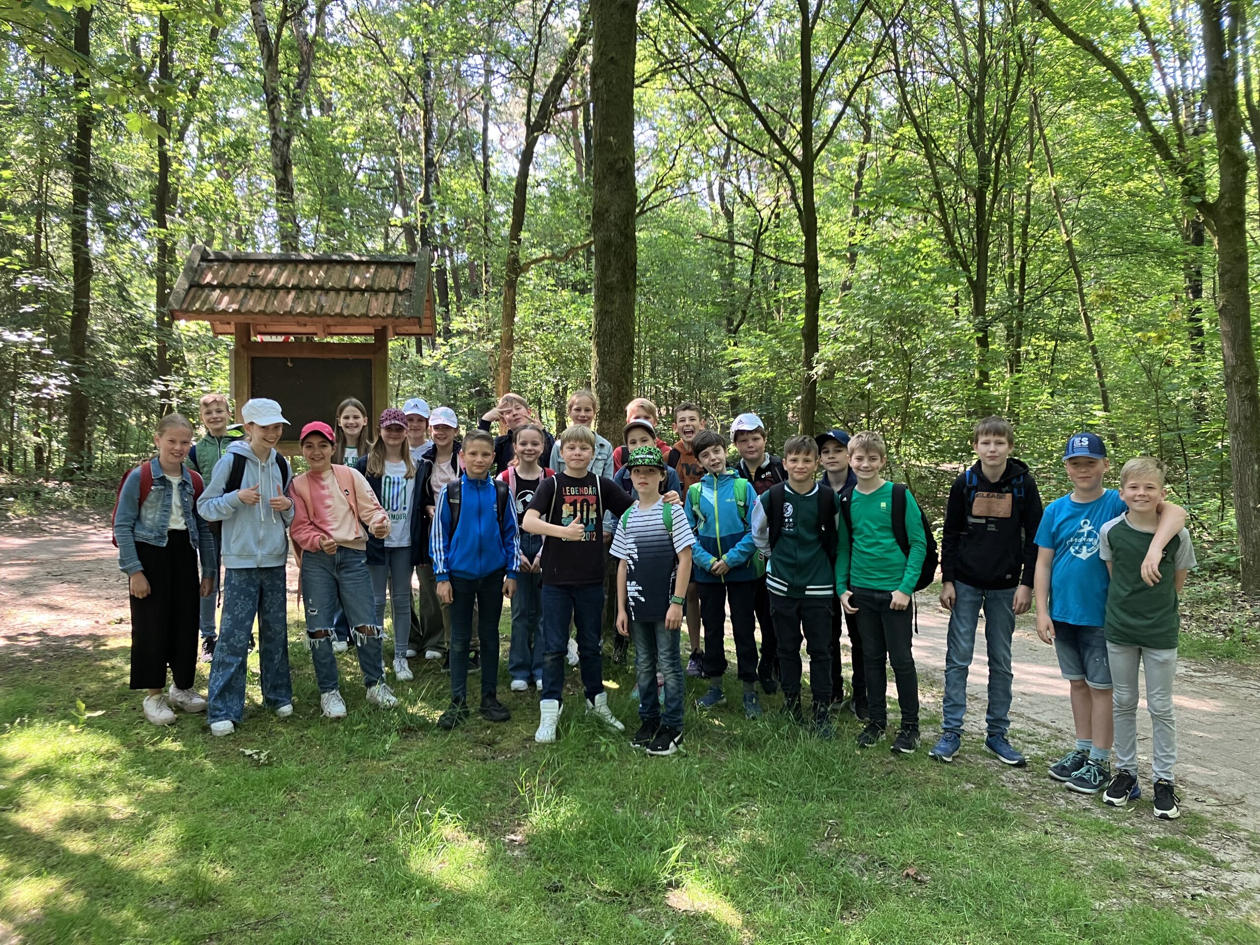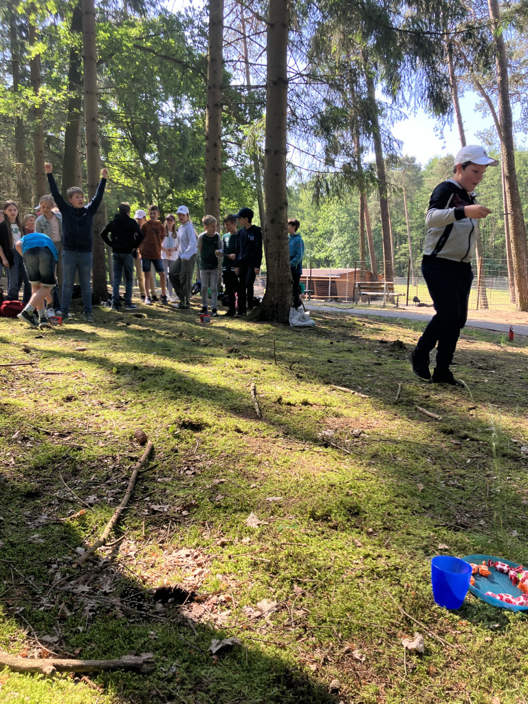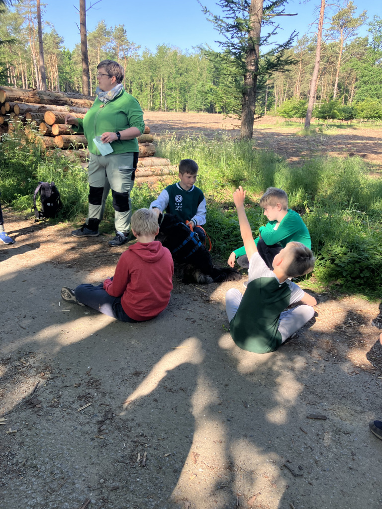 Am 06. Juni haben wir, die Klasse 5d, uns auf den Weg zum Wachholderhain gemacht. Dort haben wir Frau Köster und ihren süßen Hund Flocke vom „Walderlebnis Emsland“ getroffen, die uns zwei Stunden lang durch den Wachholderhain geführt haben. Es war eine tolle Erfahrung, denn sie hat sich viel Zeit genommen, uns viele Fragen beantwortet und interessante Fakten zum Wald genannt. So konnten wir lernen, dass der Borkenkäfer auch hier in der Region großen Schaden anrichtet und Frau Köster hat uns sogar befallene Holzstücke und Borke gezeigt. Wir haben erfahren, warum es für einen Wald so wichtig ist, wenn er aus vielen Arten besteht und beispielsweise nicht nur aus Fichten. Wir haben außerdem viele Pflanzen kennengelernt, zum Beispiel den Storchenschnabel, die Knoblauchrauke, den Wachholder, die Esche und das Klettkraut, das zu neuen Modekreationen geführt hat. Wir haben auch noch Spiele zu der Fotosynthese und zur Bedeutung der Artenvielfalt im Wald gespielt, was wirklich Spaß gemacht hat. Vielen Dank an der Stelle für die Bonbons beim Fotosynthese-Spiel! Wir hatten einen tollen Vormittag und bedanken uns recht herzlich dafür!