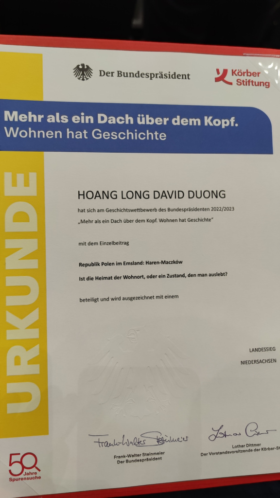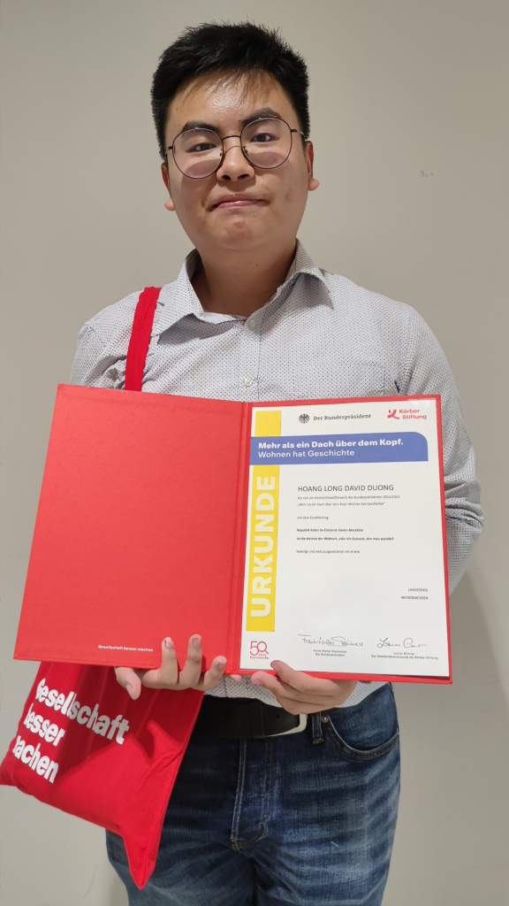 Einer dieser Teilnehmer ist Hoang Long David Duong aus dem Jahrgang 12 des Kreisgymnasiums St. Ursula Haselünne. Zum diesjährigen Thema „Mehr als ein Dach über dem Kopf. Wohnen hat Geschichte“ hat sich David unter Anleitung seines Tutors Herrn Rühlmann mit der emsländischen Nachkriegsgeschichte befasst. Bei uns im Kreis liegt nämlich die Kleinstadt Haren, die zwischen 1945 und 1948 polnisch verwaltet wurde und zahlreichen sogenannten Displaced Persons eine Unterkunft bot. Die polnischen Bewohner des Ortes nannten ihn „Maczków“ und er ist ein Beispiel für eine außergewöhnliche Wohnsituation nach dem Zweiten Weltkrieg. David führte für seinen Beitrag zwei Interviews mit einem Zeitzeugen sowie mit dem Co-Leiter des Dokumentationszentrums Maczków Inselmühlen. Außerdem nutzte er Tagebucheinträge von Zeitzeugen. Dabei kristallisierte sich heraus, dass Maczków nie eine wirkliche Heimat für polnische Menschen war, sondern mehr ein Versuch ein Stück der eigenen Identität zu etablieren. Um diesen Ort heimisch machen zu können, spielten Gemeinschaft, Kultur und Sprache eine Rolle. Herr Rühlmann hebt besonders die persönliche Involvierung seines Tutanden hervor, ihn fasziniert, dass „David Fragen an die emsländische Vergangenheit gestellt hat, um Antworten für die eigene Gegenwart und Zukunft zu finden.“
