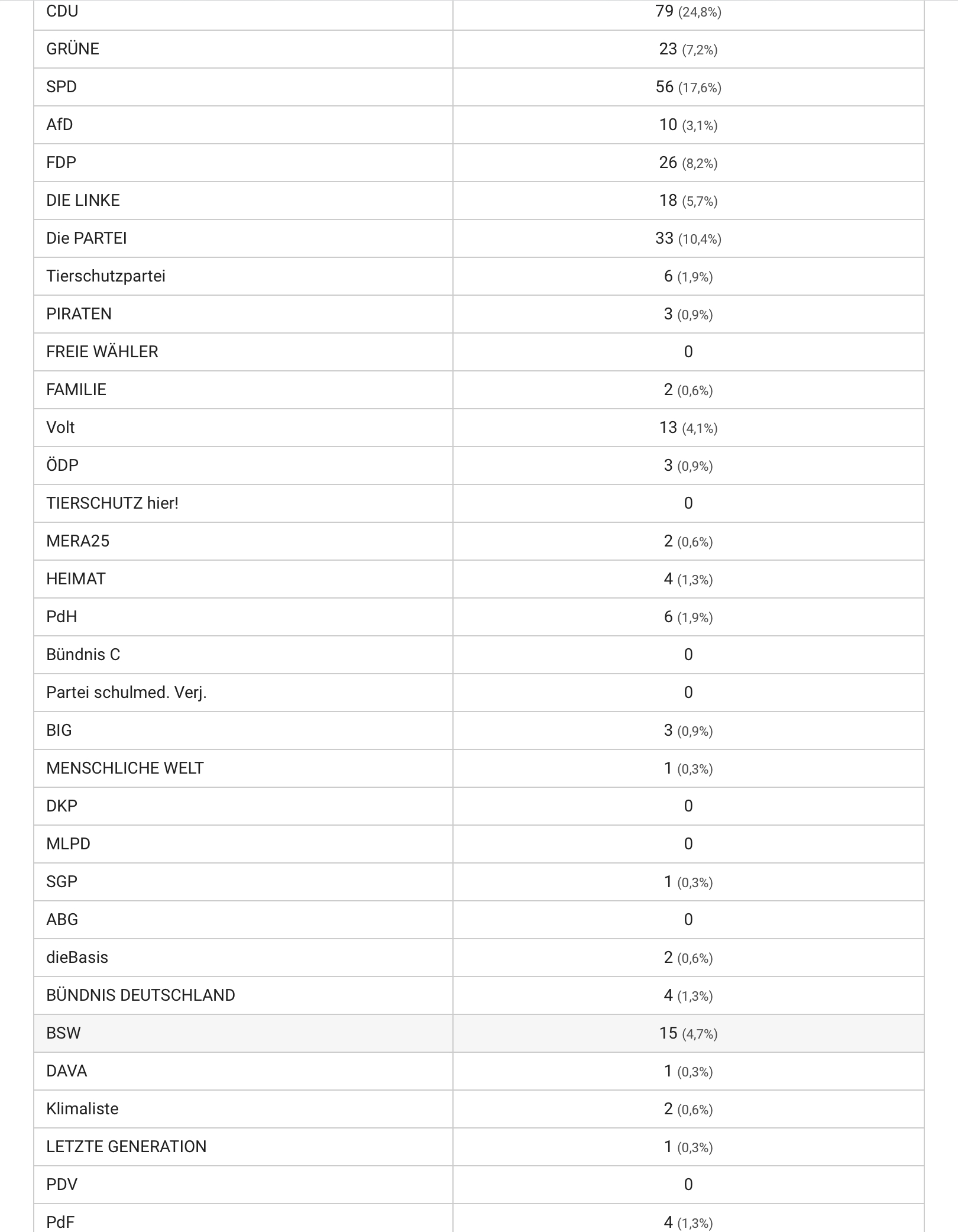 Die Wahlbeteiligung lag bei 92,44 Prozent. CDU, SPD und Die Partei bekamen die meisten Stimmen. Es folgten FDP, Grüne, Linke, BSW, Volt und AfD.