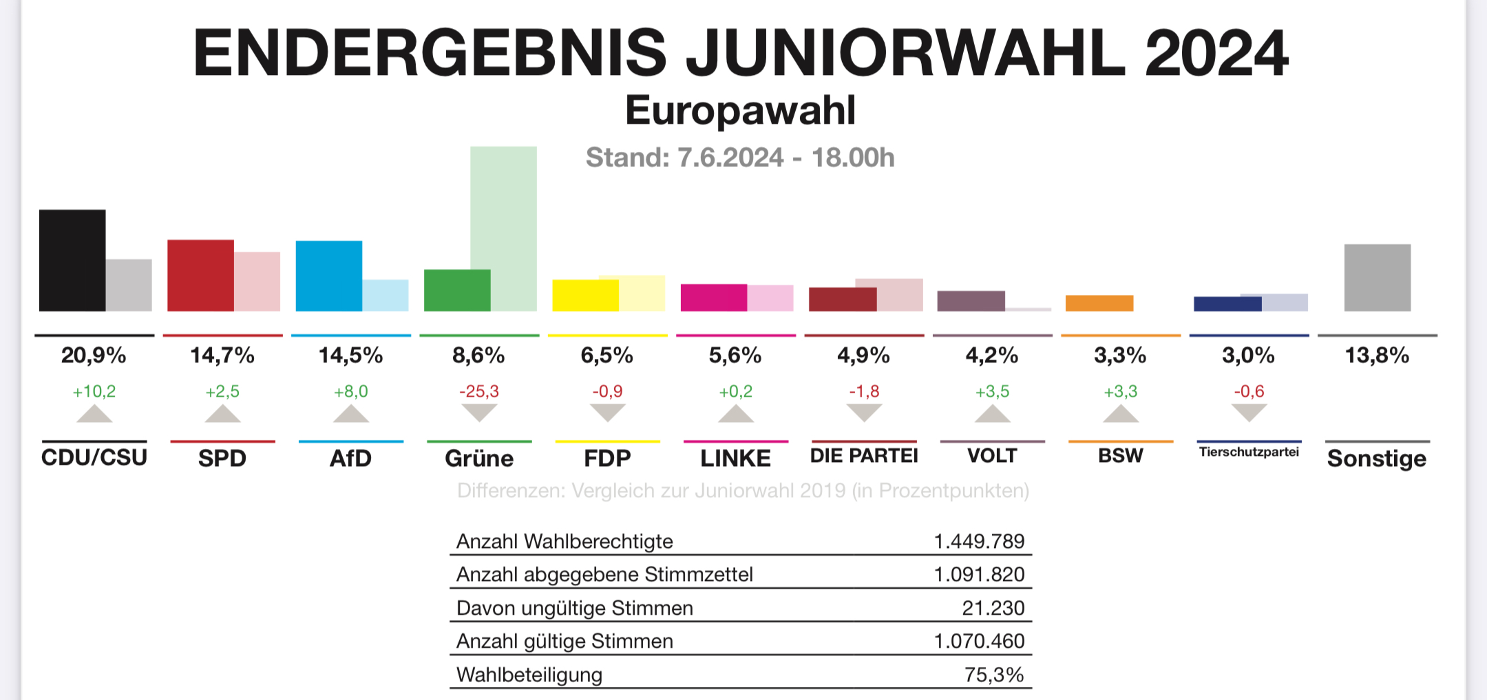 Im Vergleich zum Ergebnis der Juniorwahl in ganz Deutschland erhielten CDU und Die Partei am Kreisgymnasium deutlich mehr Stimmen, die AfD deutlich weniger.