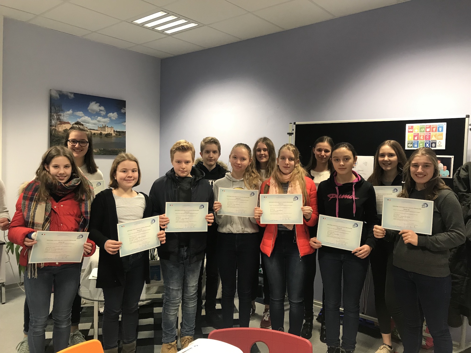 Regelmäßig legen Schüler des Kreisgymnasiums das französische Sprachzertifikat ab. DELF steht für Diplôme d’Etudes en langue française und ist ein französisches Sprachzertifikat, das seinen erfolgreichen Absolventen Sprachkenntnisse - unabhängig von der Schulnote - auf den Niveaustufen A1 bis B2 des 'Gemeinsamen europäischen Referenzrahmens' bestätigt, je nach Leistungsstand und gewähltem Niveau. Das Diplom trägt das Siegel des französischen Kultusministeriums und ist ein Leben lang gültig. Die Vorbereitung auf die Prüfung erfolgt in der Regel in einer AG, aber auch im Fachunterricht.